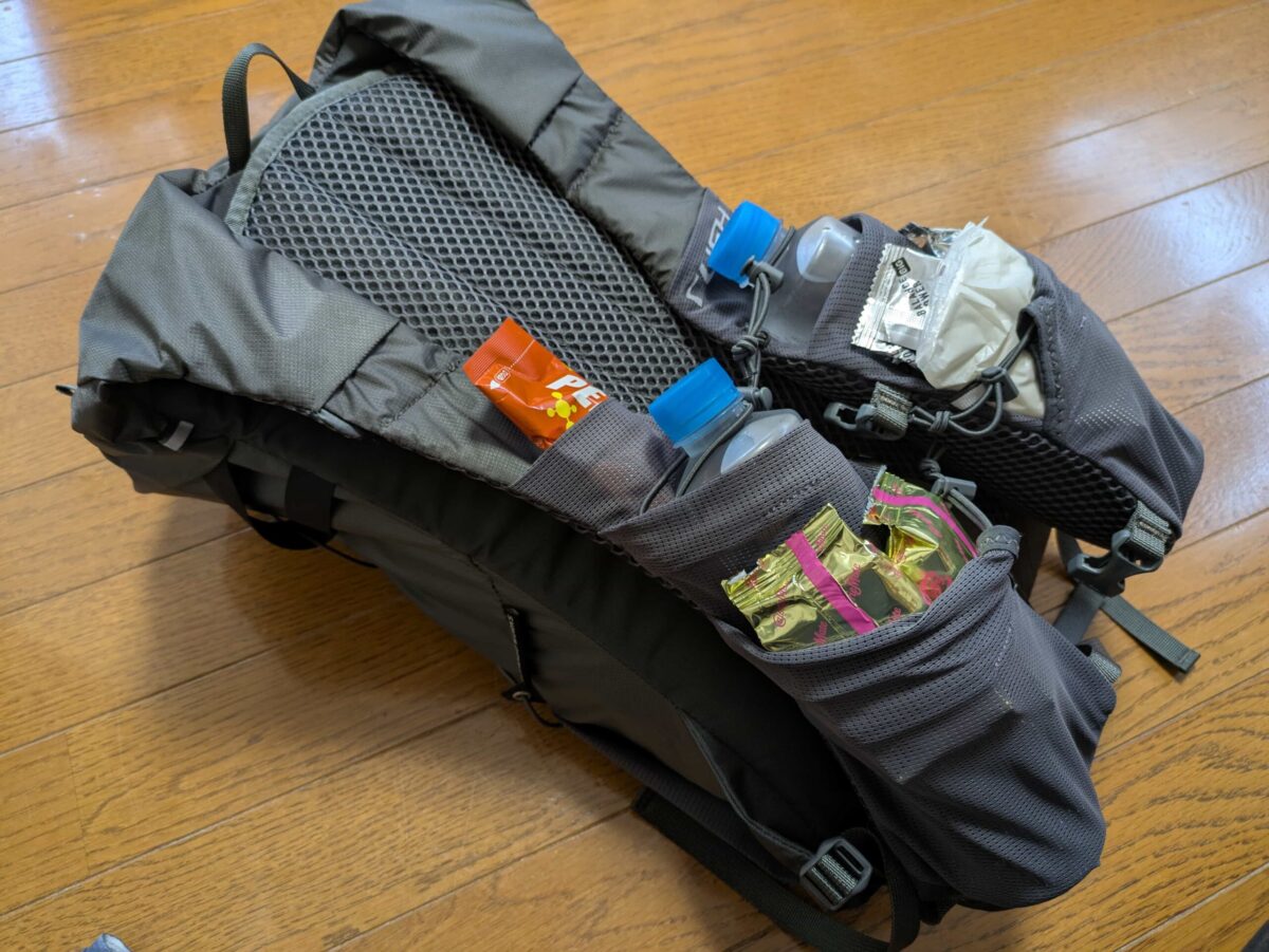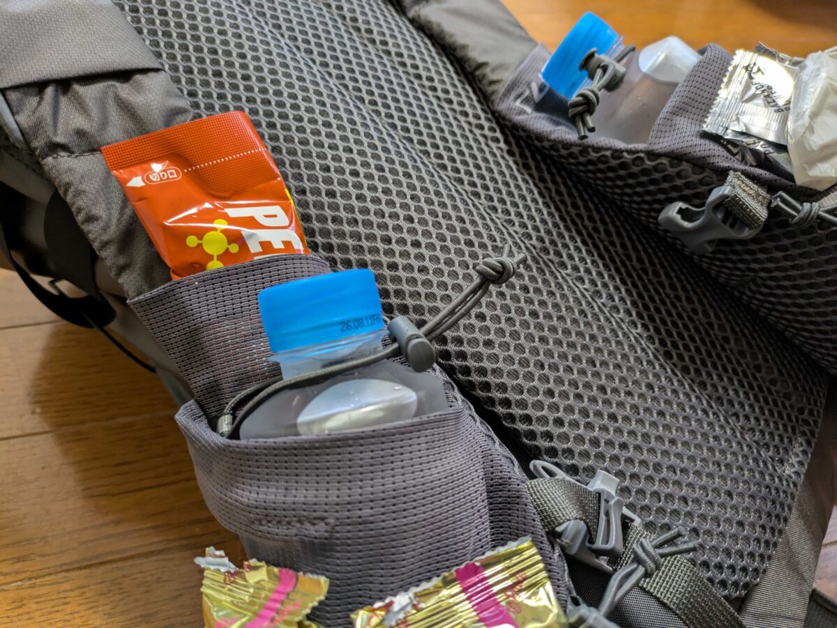 ショルダーポケットもかなり使いやすいです。サイズ違いが左右に3つあり、上段から順にサプリ、ボトル、行動食を入れておくのに重宝します。ポケットの深さもあるためスッポリ入ります。中段と下段にはドローコードがあるためホールドも可能ですが、ファスナータイプではないためスマートフォンを入れるとおそらく飛び出ます。