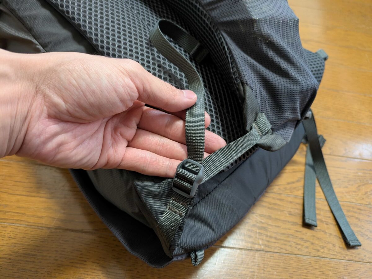 チェストストラップと脇下にあるストラップがベルト仕様なので伸縮性がありません。したがってギュッと締めると安定する代わりに窮屈感が出てしまいます。ただし耐久性を考慮すると、伸縮性よりも非伸縮性のほうが優れていると思います。厳密に言うと全体が少し撓むおかげでガチガチに固定されるわけではありませんが、いずれにしても好みが分かれそうです。