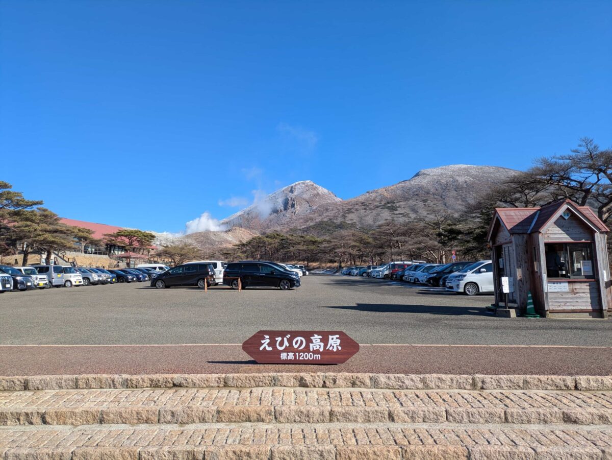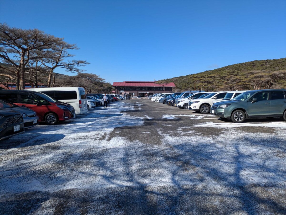 えびの高原にはザ・観光地って感じの広大な駐車場が完備されています。この時間でもなのか、この時間だからなのか第一駐車場は満車です。ひとまず駐車料金500円を前払いして準備を整えたら登山口へと向かいます。ここから眺めるだけでもすんごい景色に圧倒されます。硫黄山からは蒸気が吹き上がっており、韓国岳は真っ白な霧氷の世界に見えます。