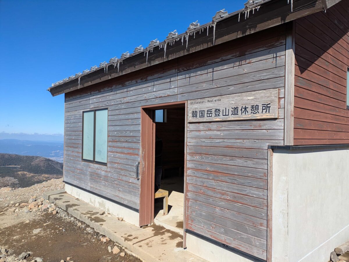 あっという間に五合目の韓国岳登山道休憩所に到着です。心なしか高千穂峰よりも登山道が登りやすく感じたのは、大勢の登山者に踏み慣らされているからでしょうか。ゴツゴツした岩はありますが特に危ない箇所はなくスムーズに登ってきました。それにしても青空と霧氷のコラボレーションが素晴らしいですね。全然見飽きません。上ばかり見すぎて足元が疎かにならないように気を付けましょう。