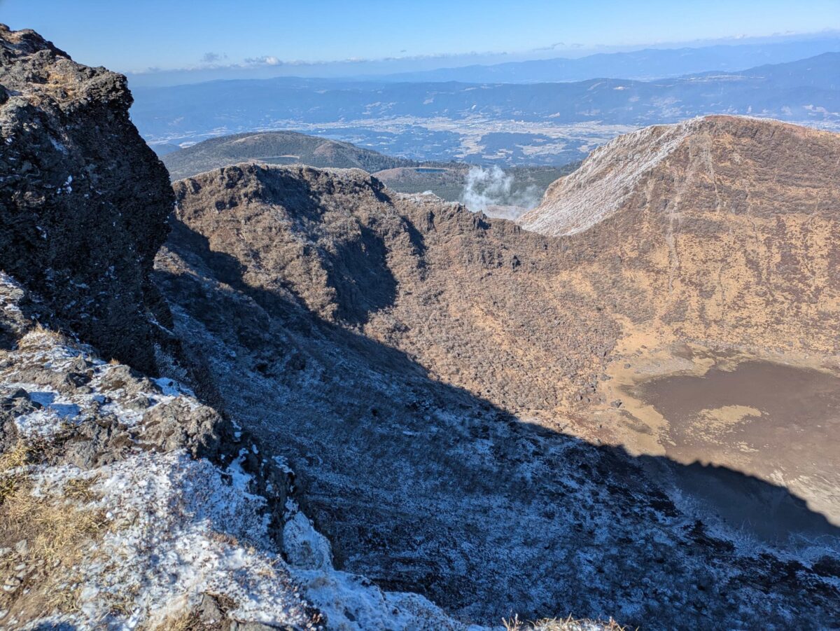 ということで韓国岳に登頂です。標識のすぐ裏は爆裂火口ですが、木柵等ないため万が一落ちてしまったら即死です。風も強いため諸々飛ばされないように十分注意しましょう。高所恐怖症だと覗き込むことも不可能でしょう。