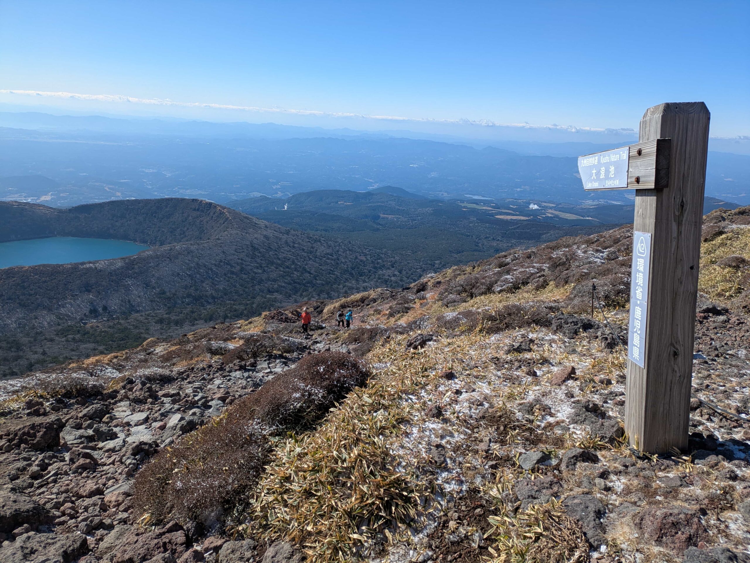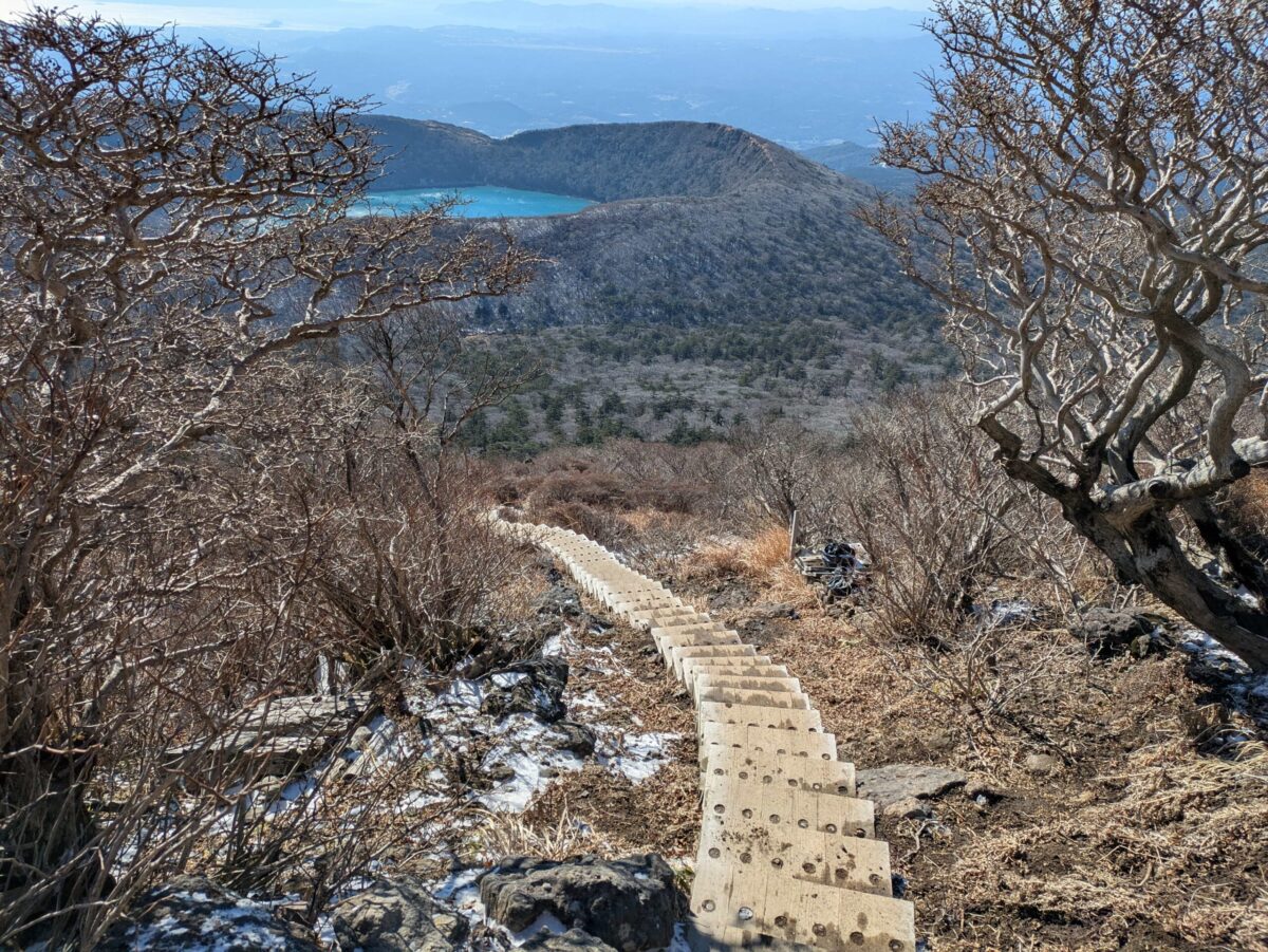 こちらの景色も素晴らしいです。手前の大浪池から鹿児島県の南西方面がよく見えました。それとこちらの登山道は木道なんですよね。木道…この時間は大丈夫でしたがめっちゃ滑るから苦手なんですよね。