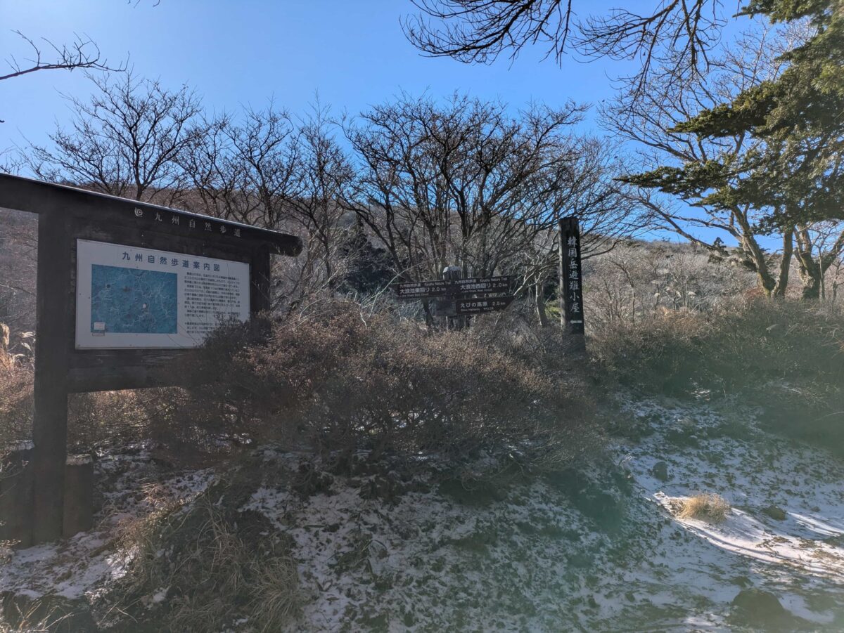 厳密には避難小屋には寄っていませんがここが分岐点となります。時間があれば大浪池を周回したかったのですが今回はパスです。高度はすっかり低くなったので、あとは勾配のない樹林帯をえびの高原までひたすら進みます。