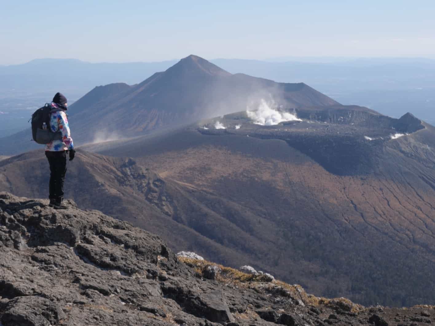 登山口となる「えびの高原」から見上げる霧島連山はすでにすっごい迫力です。新潟では普段見慣れない現在進行形で火山活動を続けている山々が軒を連ねています。興奮しますね。地球は生きている。