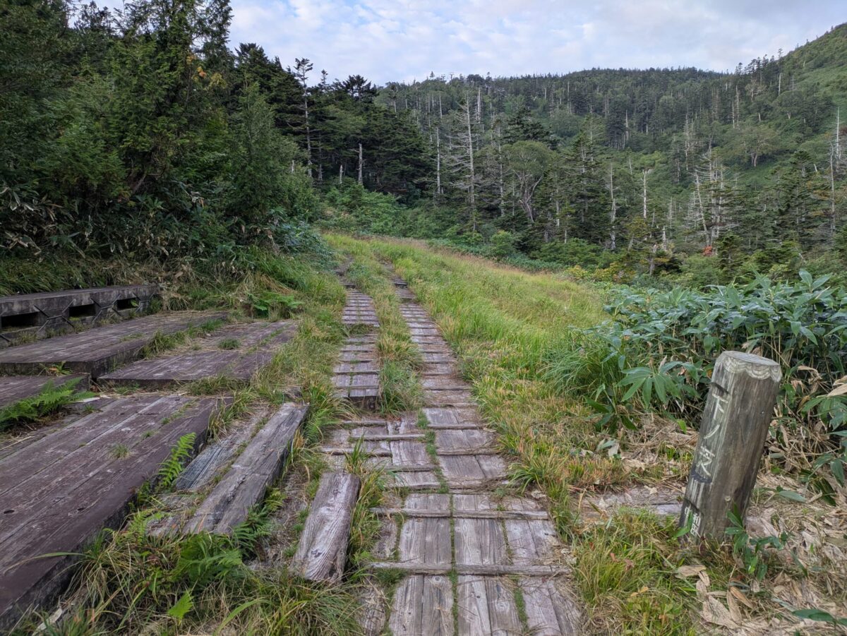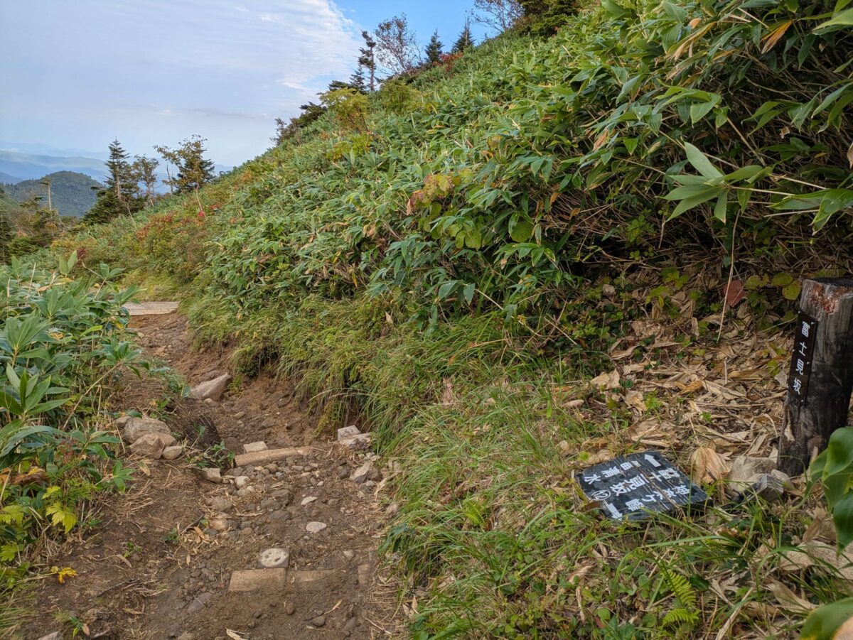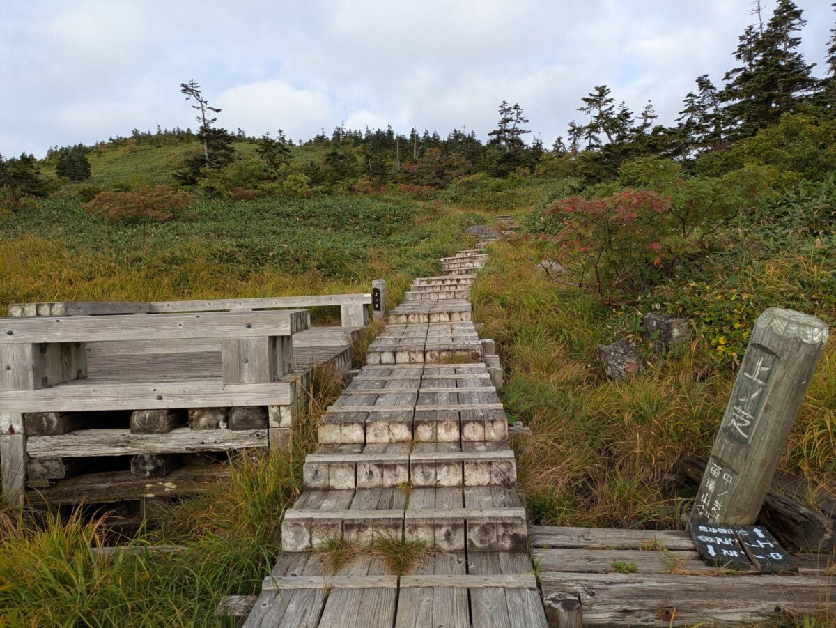 地味に登り続けると下ノ芝です。この辺りから木道が増えてきます。展望も開け始め、いよいよ高くなってきたなと実感するでしょう。立ち枯れした木々が目に付きます。以前赤湯コースから登ったときにもありましたが、「○合半」という刻み方は苗場山独特でしょうか。