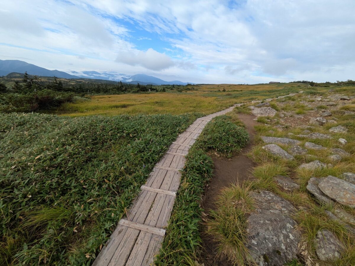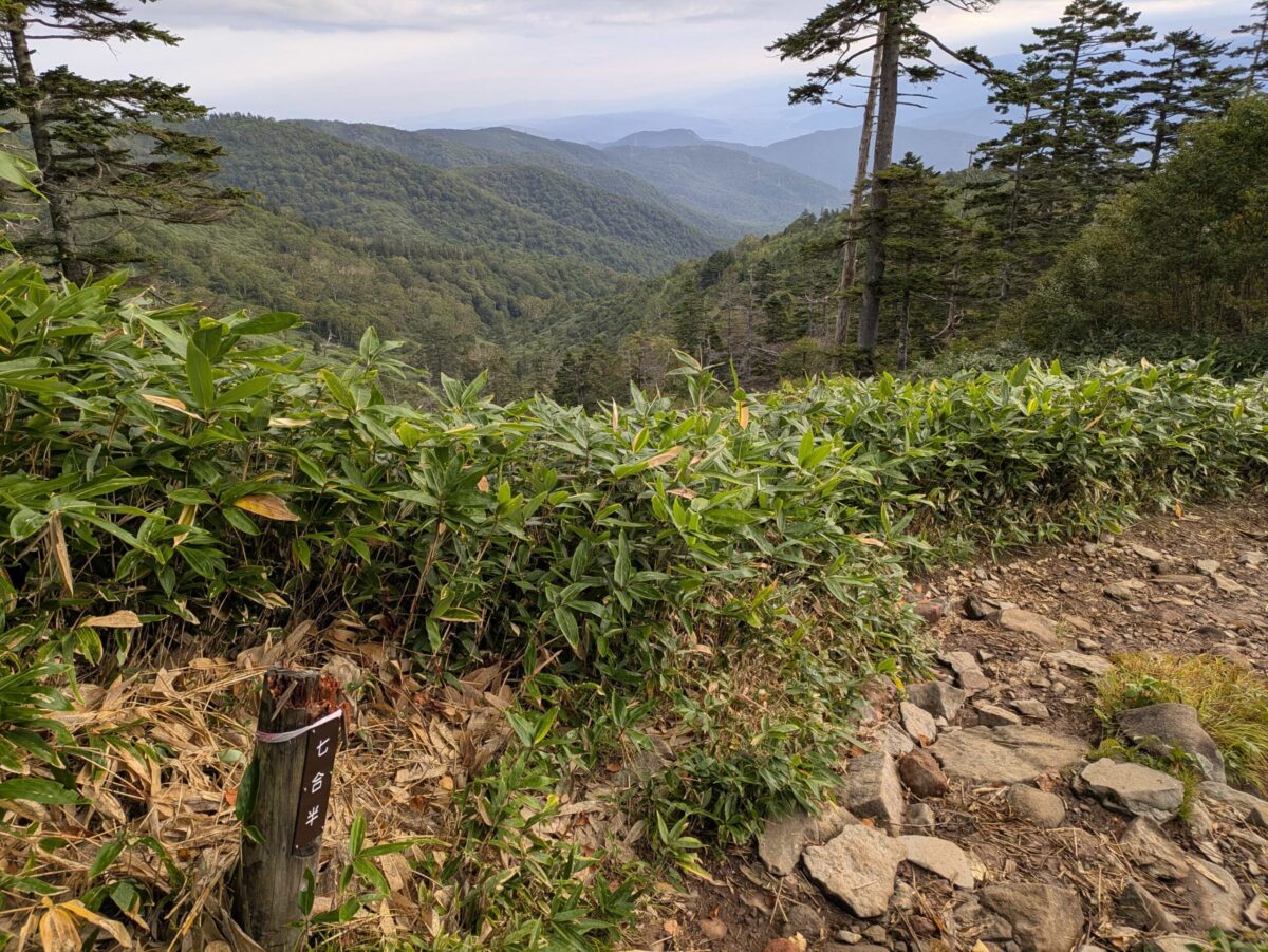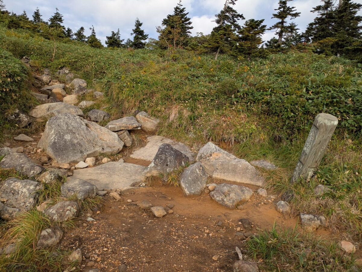 地味に登り続けると下ノ芝です。この辺りから木道が増えてきます。展望も開け始め、いよいよ高くなってきたなと実感するでしょう。立ち枯れした木々が目に付きます。以前赤湯コースから登ったときにもありましたが、「○合半」という刻み方は苗場山独特でしょうか。