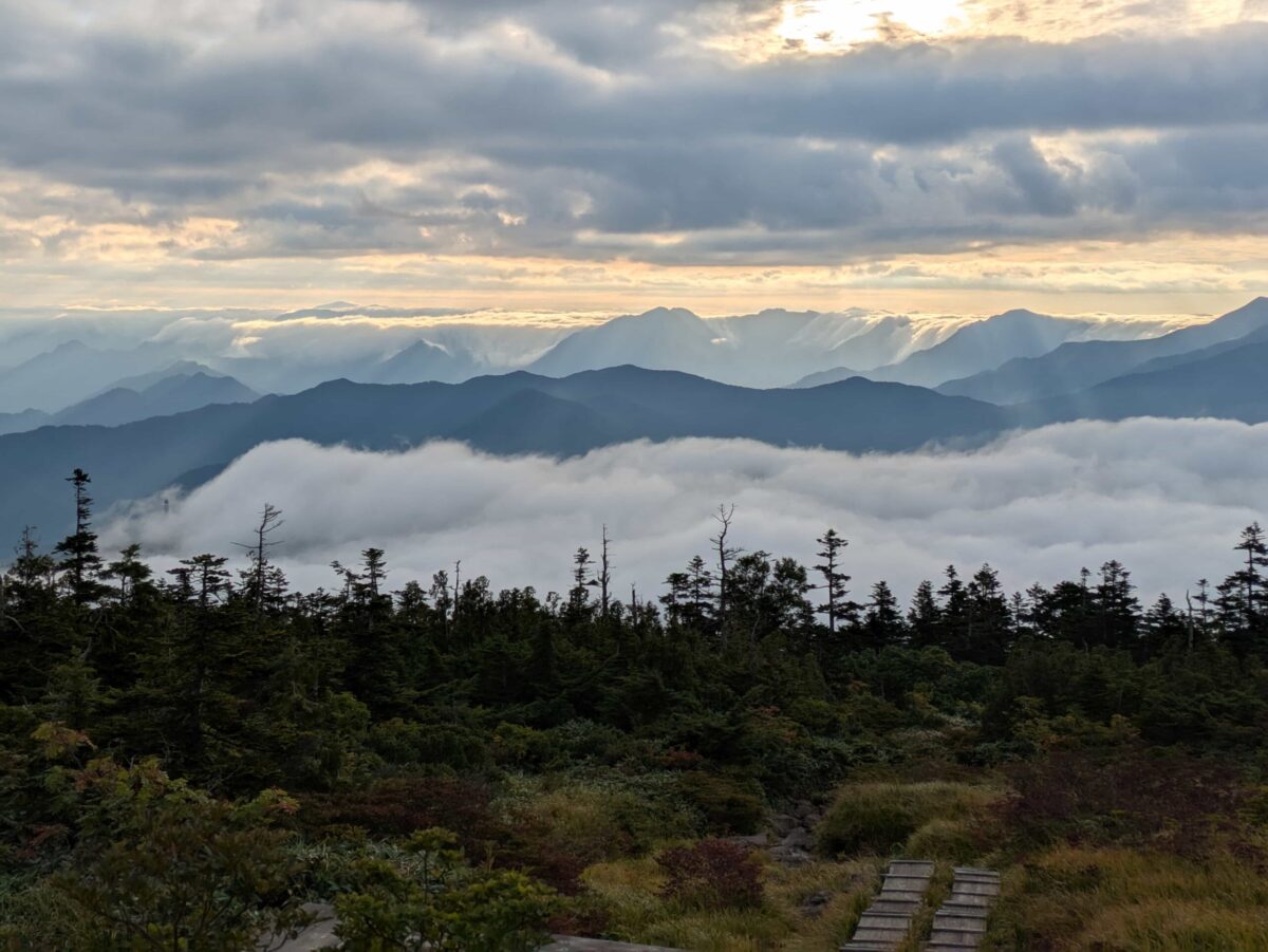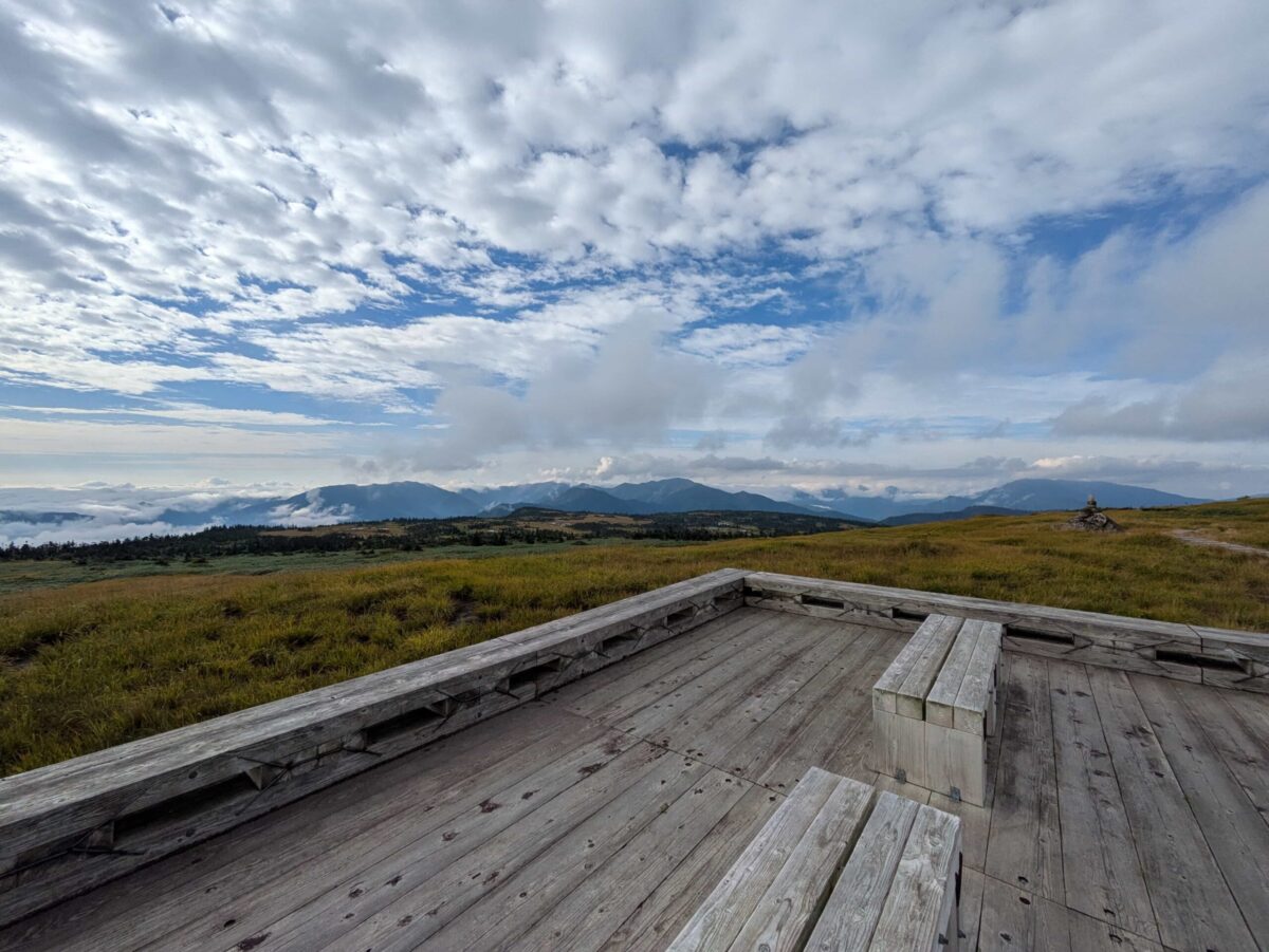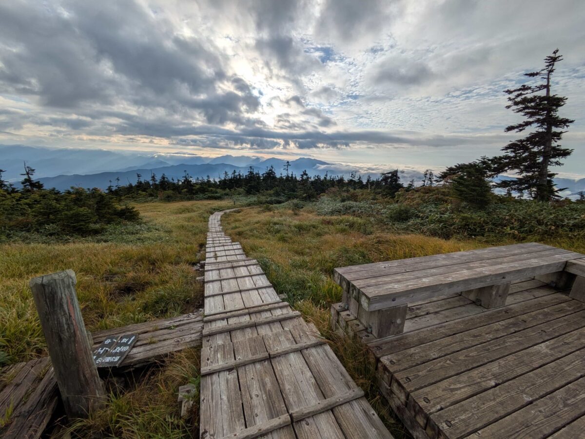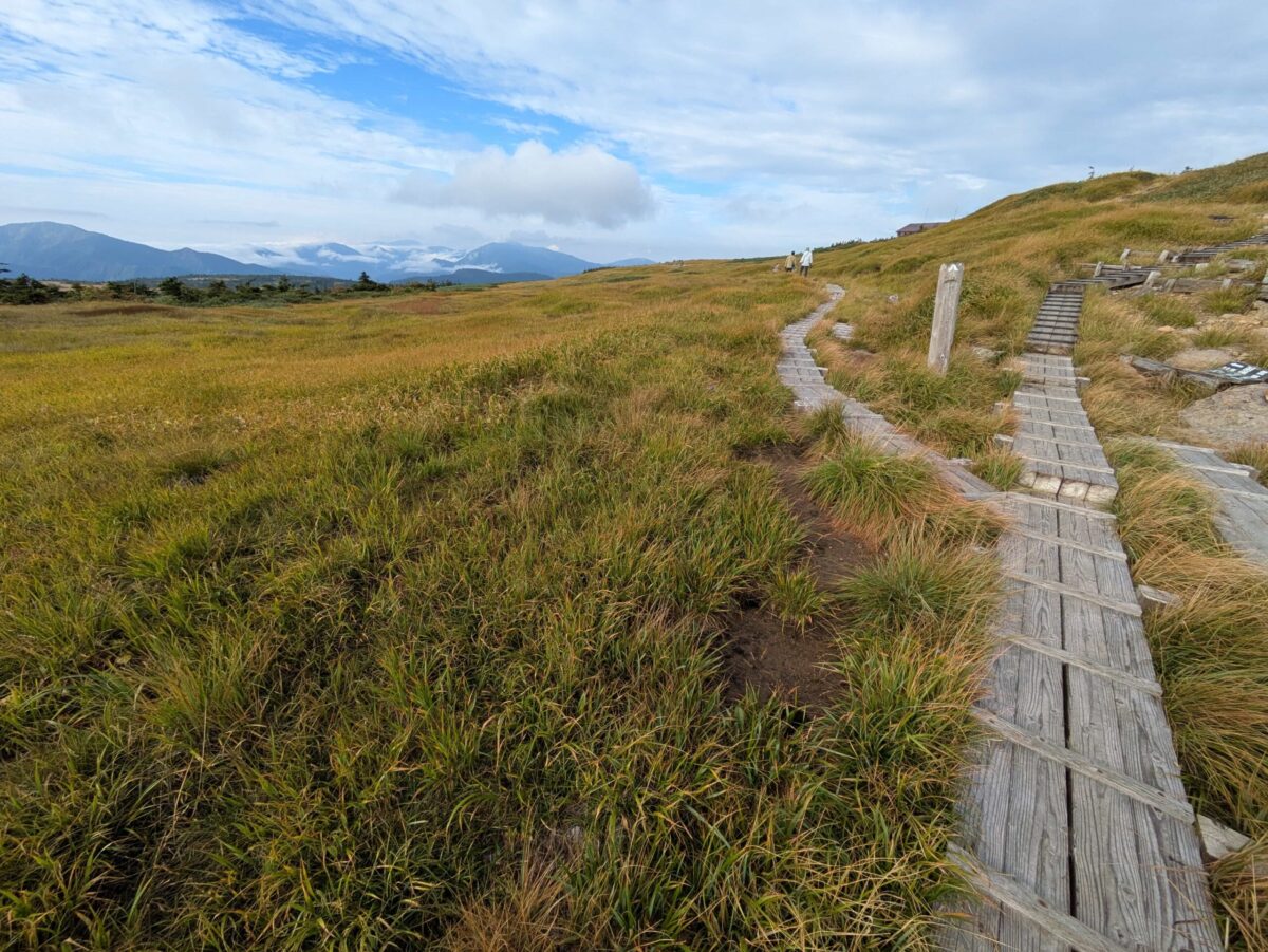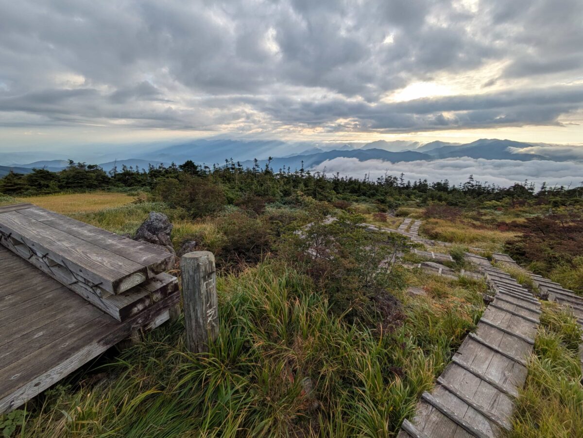 木道を進むと中ノ芝です。見上げた景色も良かったですが、振り返ると木道越しに見事な景色が広がっています。遠くには雲海からの滝雲が確認できます。気温が上がってくると雲も高くなってくるので早朝がベストでしょう。この辺りから草紅葉が感じられるようになります。