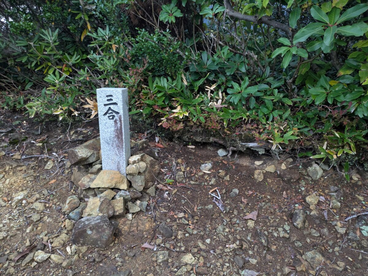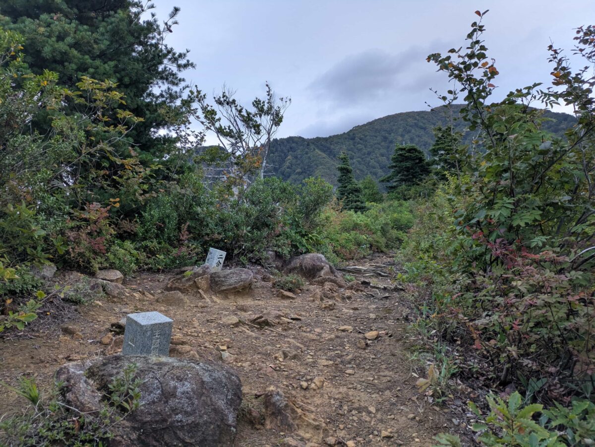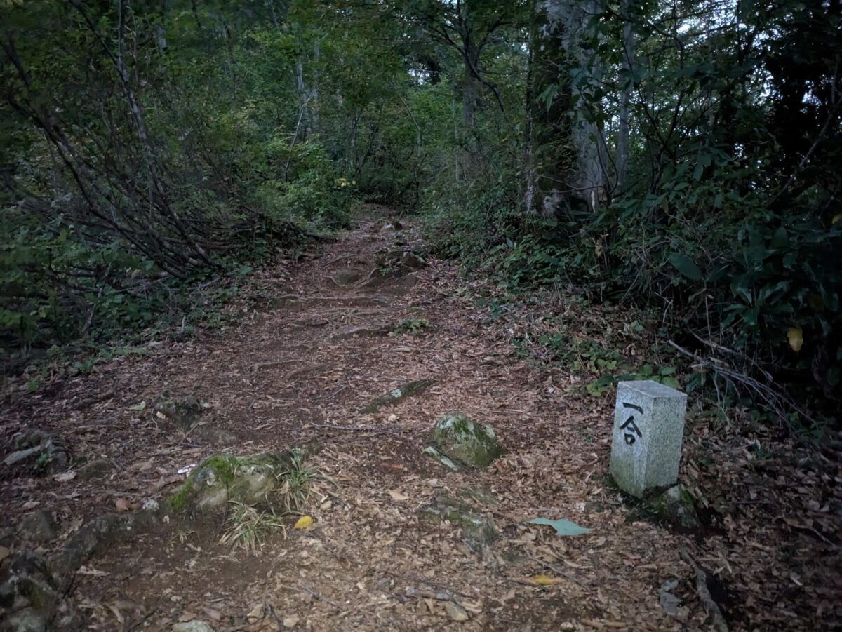 時間的にはあっという間に一合目って感じですが、すでに疲労感がすごいです。一合目を過ぎてもなお急登が続きますが、この辺りで尾根に出るので視界が開けてきます。登山道は意外とゴツゴツした岩場が多いため足元には注意しましょう。写真にはありませんが周囲の山々が確認できました。