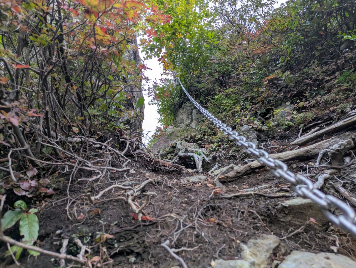 誰が呼んだのかわかりませんが、中ノ岳の最後の急登は「変態急登」と呼ばれており、一歩登るたびに高度を上げていきます。なおこの先、登山道が一部崩落している箇所があります。滑り落ちる程ではありませんが、特に下山時は注意しましょう。
