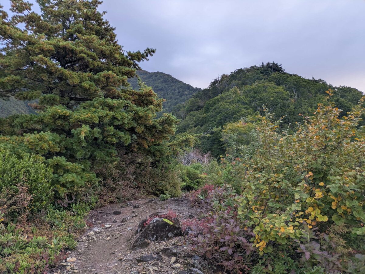 やや平坦な二合目に到着です。ここには相当の年数を経たキタゴヨウがあります。まだまだ中ノ岳は見えません。尾根にはなんとなく色づきが見られます。しばらく岩稜帯を歩きます。