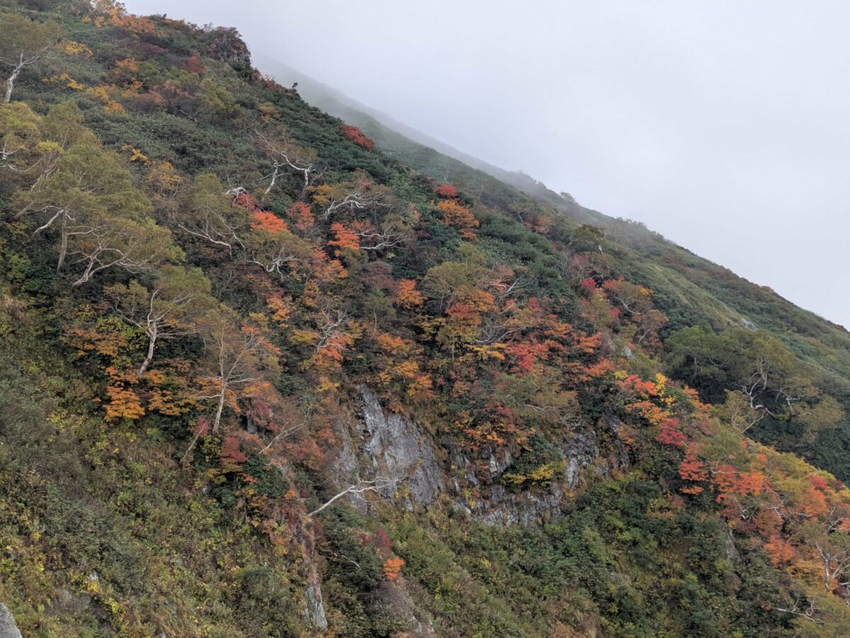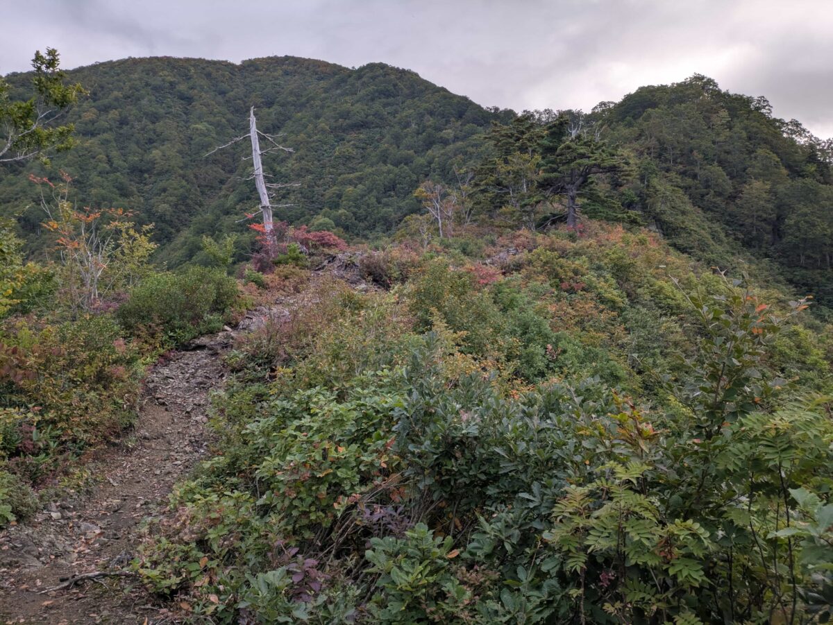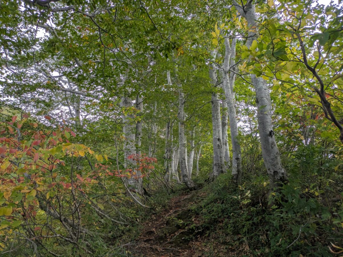 何度も何度も何度も足を止めながら進みます。横目には丹後山から続く美しい稜線が、反対側には八海山から続くいかにも険しい稜線が見えていました。加えて赤く色づいた斜面にダケカンバ?の白色が良いアクセントになっておりとても美しいです。疲れながらも楽しみたい瞬間です。