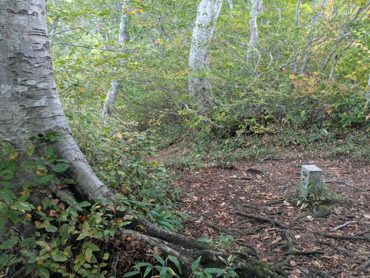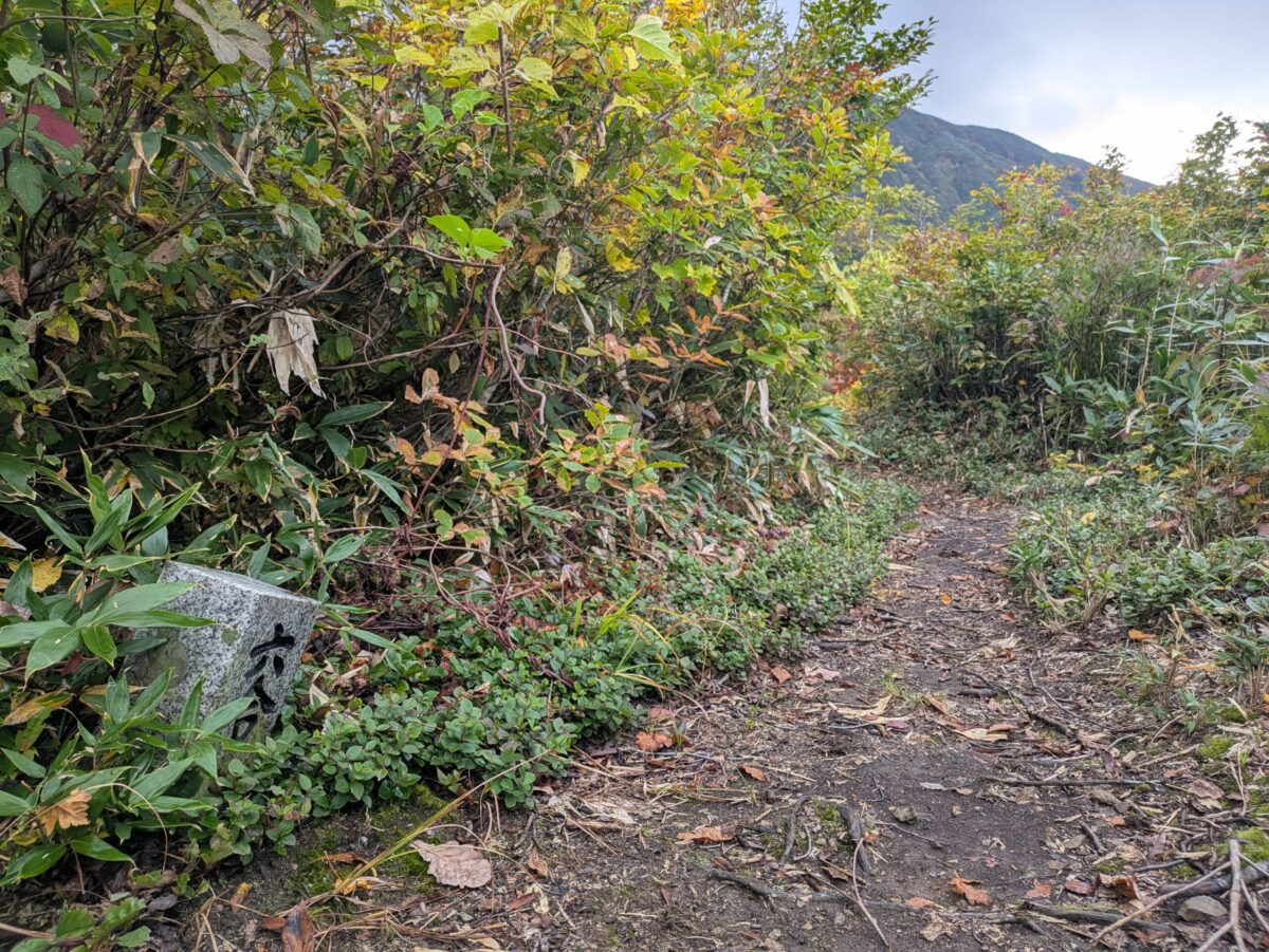 三合目で先行組に追いつきました。今日は中ノ岳避難小屋に泊まるとのことで、皆さんそれ相応の荷物を背負っておられました。健脚です。ところで三合目には特に何もありませんが、もうしばらく岩稜帯を歩いた後、ブナの樹林帯に入ります。