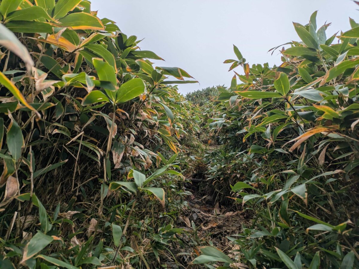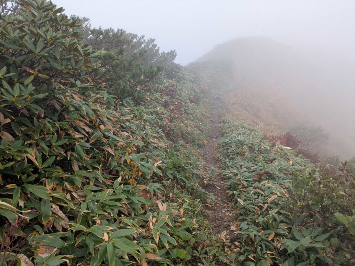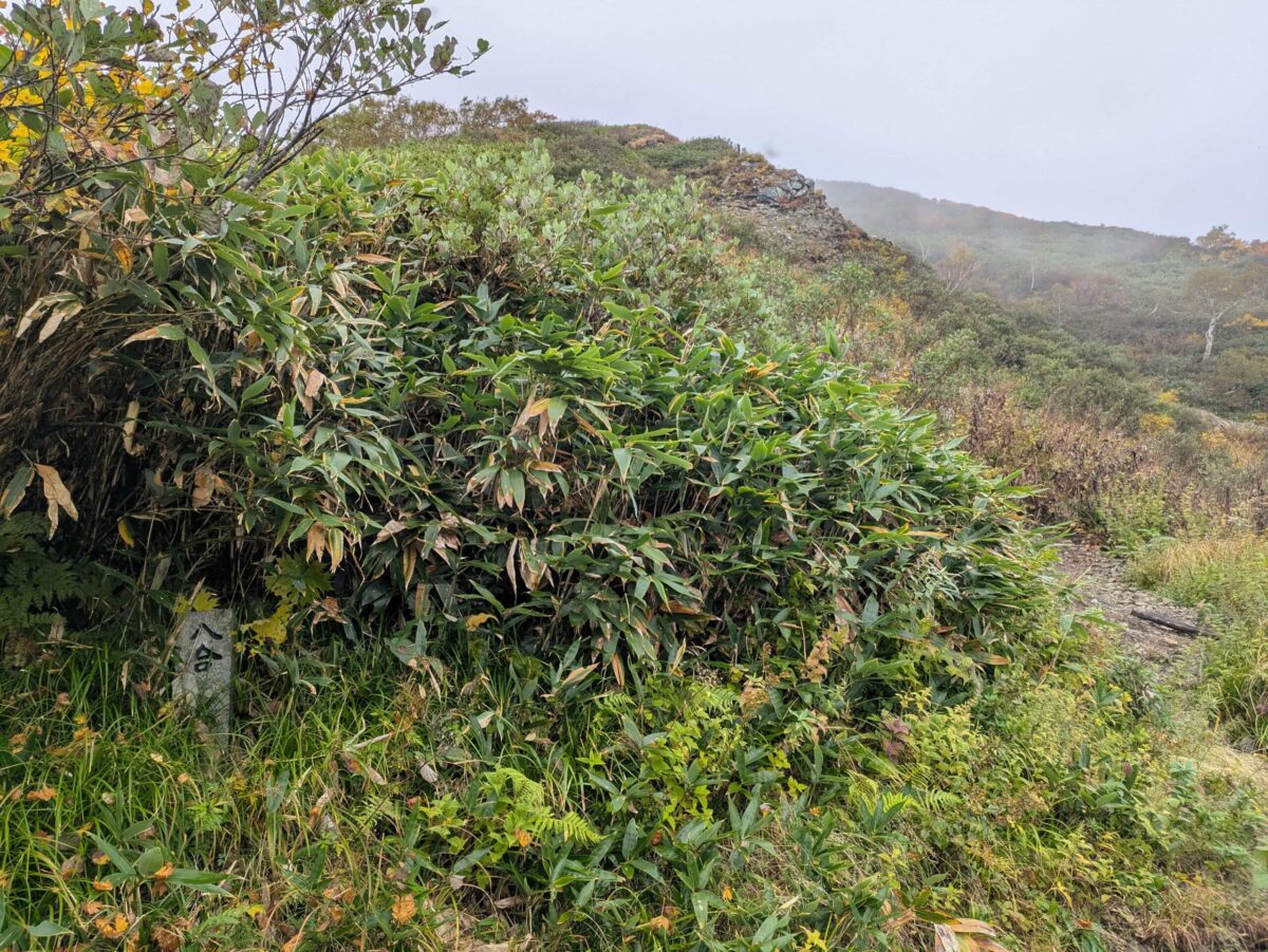 なんだかんだしていると思いがけず八合目に到着です。ここまで来ればもう一息です。チシマザサに囲まれた登山道を一歩一歩登っていきますが、この辺ですっかりガスに覆われてしまい視界はゼロです。