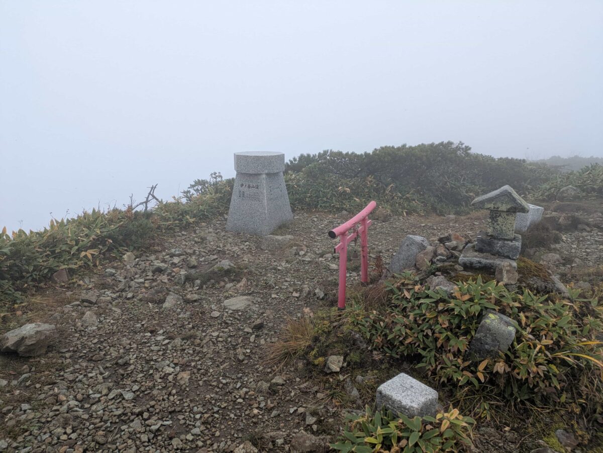 人生2回目の中ノ岳に無事登頂です。荷物少ないくせにスーパーハードでした。中ノ岳は標高が頭一つ抜けているため、視界さえ良ければ360度の大パノラマが楽しめます。遠くには富士山を目視することもできます。少なくとも前回は見えていましたが今回ばかりは仕方がありませんね。