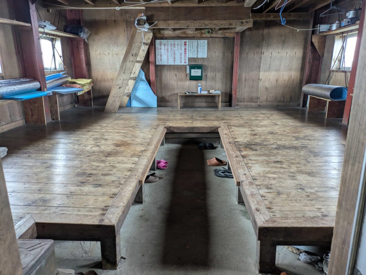 山頂から少し下ったところに綺麗に管理された中ノ岳避難小屋があります。2階建てで収容人数は50人程度、和式トイレもあるので助かります。宿泊自体は無料ですが「お気持ち」としていくらかお支払いするのが礼儀でしょう。水場の代わりに巨大なポリタンク内の天水が利用できるはずですが今回は未確認なので不明です。